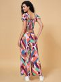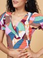 Layered Sets: Abstract Printed V-Neck Puff Sleeve Top & Bottom