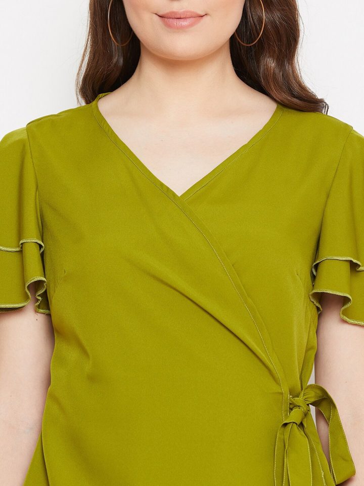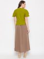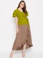 Stylish green and brown overlapping top paired with a ruffled skirt. Perfect layered set for chic and comfortable everyday wear.