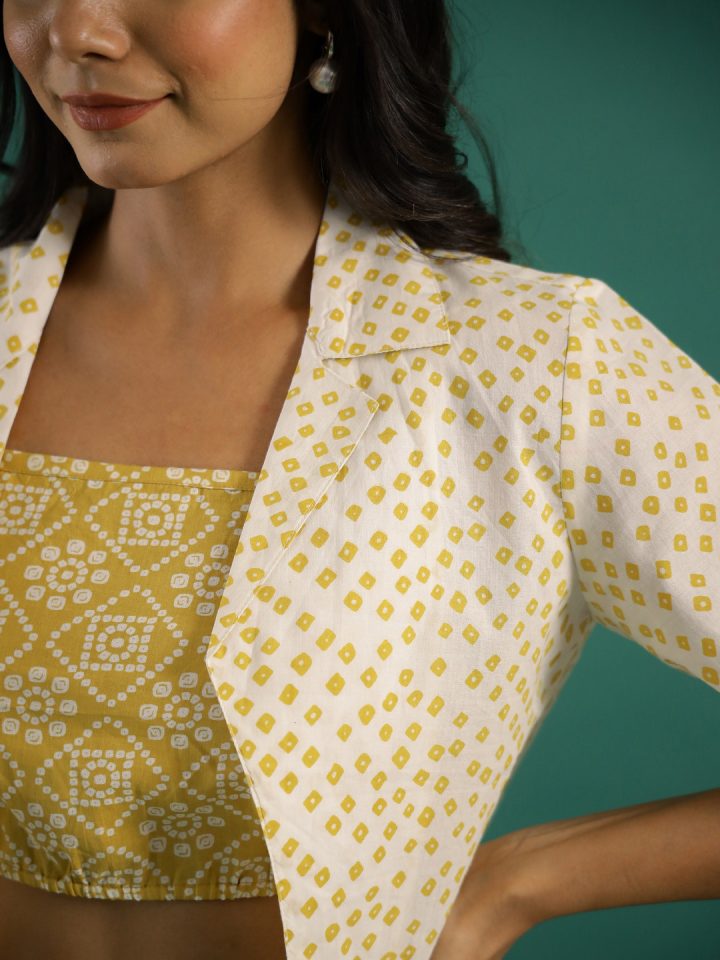 Elegant printed cotton top and skirt paired with a matching jacket. Perfect for festive and casual occasions.