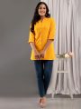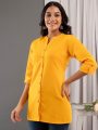 Yellow solid top has Mandarin collar, button open shirt style, with a roll up sleeve