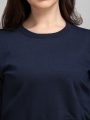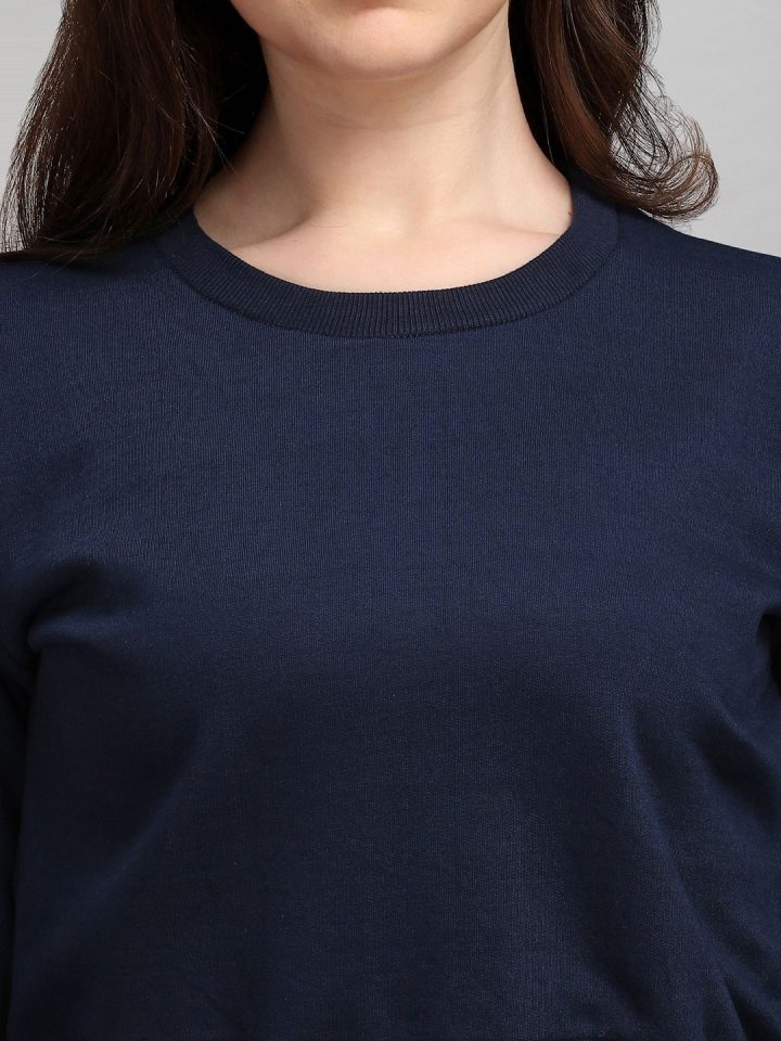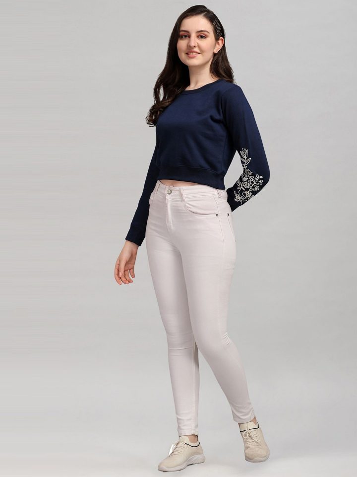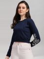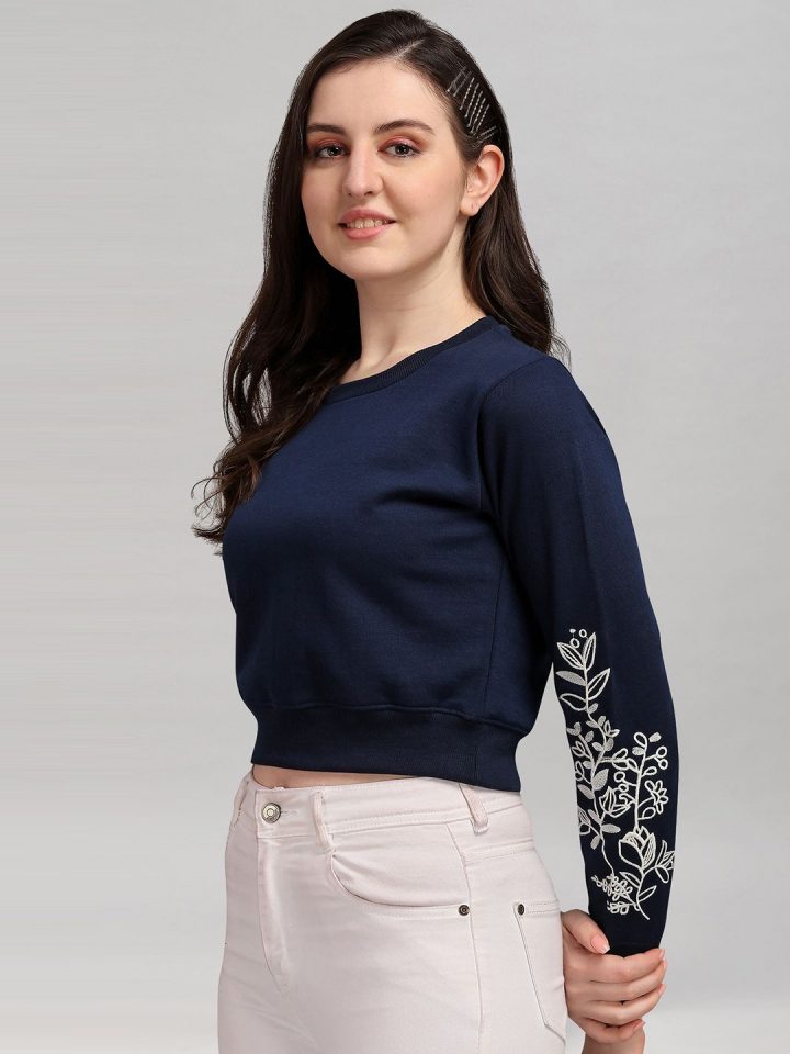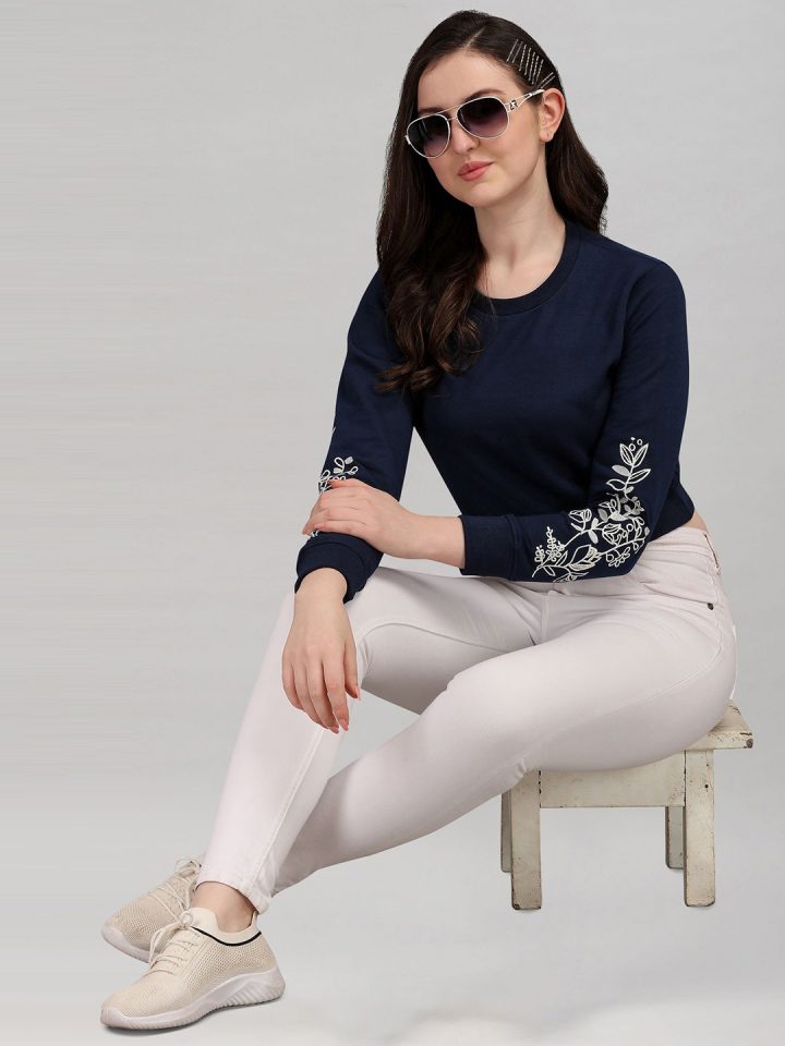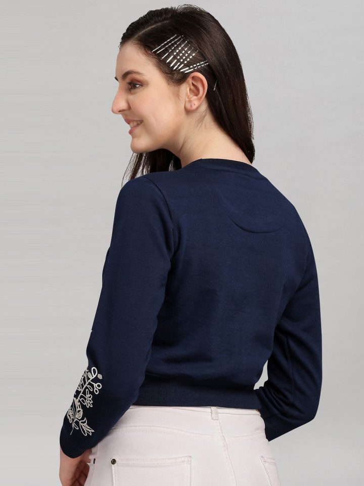 Navy blue embroidered sweatshirt has a round neck, long sleeves, ribbed hem